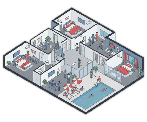 Elimine brechas de seguridad en áreas comunes y habitaciones con monitoreo en la nube. Reduzca costos operativos supervisando al personal de limpieza y vigilancia. Proteja su reputación y evite demandas por responsabilidad civil mediante evidencia forense digital irrefutable.